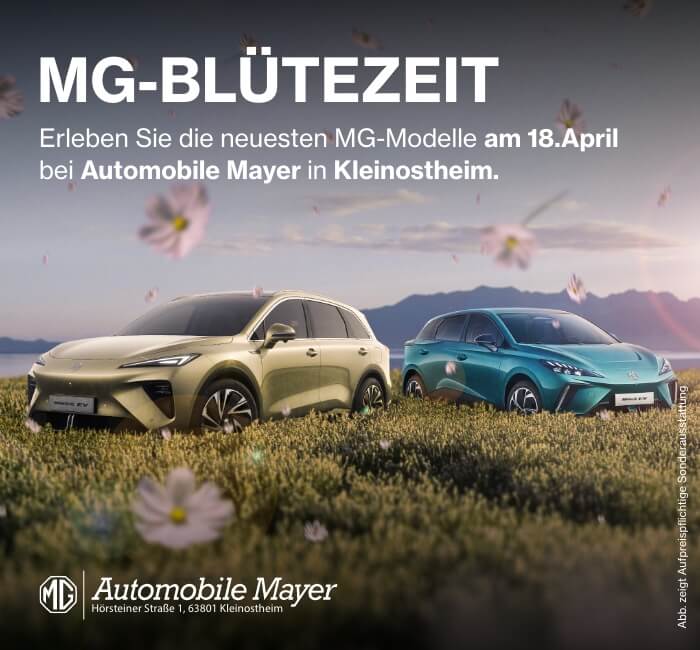 Erleben Sie von 9:00 bis 13:00 Uhr die „MG-Blütezeit“ bei Automobile Mayer in Kleinostheim! Entdecken Sie die neuen Modelle MG4 EV und MGS6 EV live vor Ort. Lassen Sie sich von elektrischen Highlights und innovativer Technik begeistern. Wir freuen uns auf Ihren Besuch und eine persönliche Beratung in Frühlingsatmosphäre!